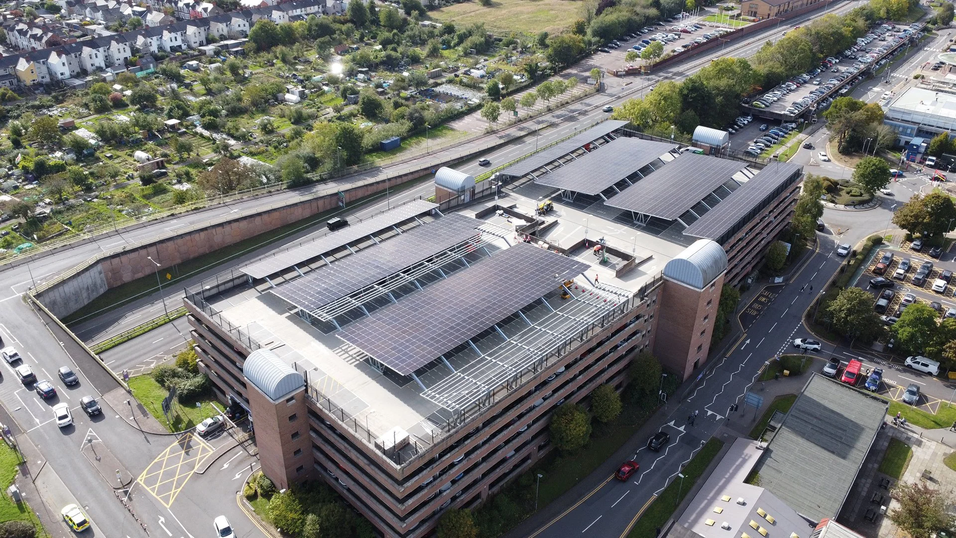 Work completed by RenEnergy UK Ltd included the design, installation, and commissioning of a multi-storey solar carport system within a live NHS hospital environment. The carport is located directly beneath the operational flight path of the Air Ambulance helipad and adjacent to a blue-light emergency access lane at the lower level of the car park; both critical assets remained fully operational for the entire duration of the construction phase.